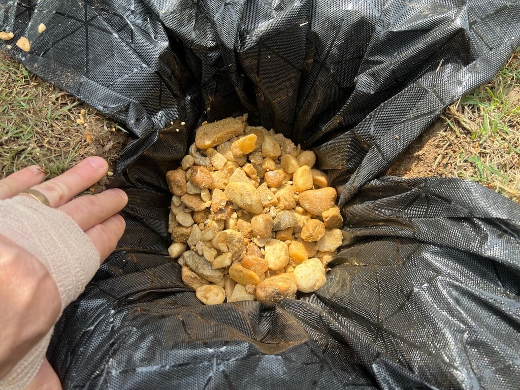 next i encased each hole with garden fabric and filled them ~80% full with river rock from Home Depot. this provides drainage for water while keeping the ground functional (it won't collapse when you walk on it).